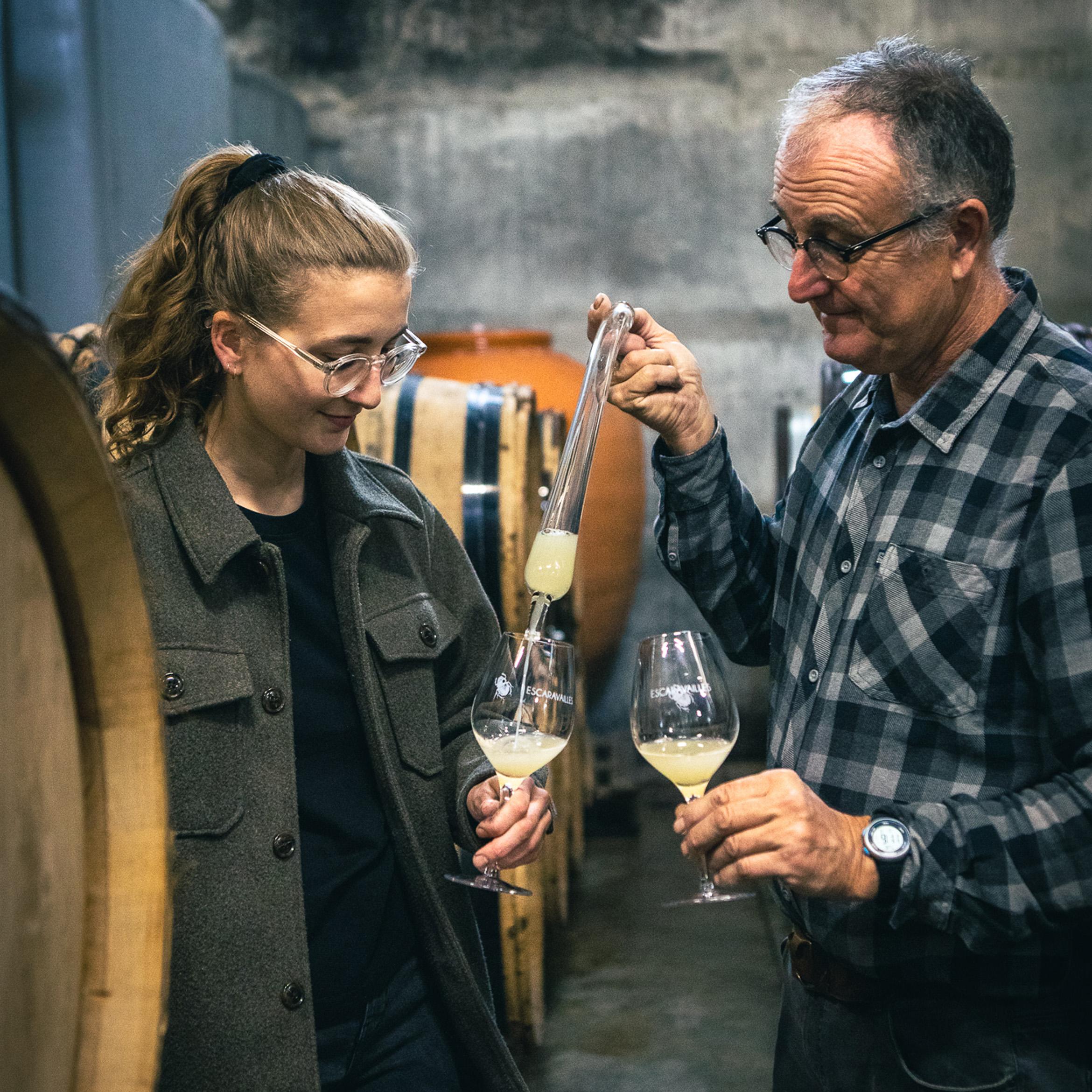 Het verhaal van Domaine des Escaravailles begint in 1953, wanneer Jean-Louis Ferran, de overgrootvader van Madeline, een vervallen boerderij ontdekt in de heuvels van Rasteau. Zonder elektriciteit, zonder stromend water en zonder wijngaarden, maar mét een adembenemend uitzicht op de vallei, de Mont Ventoux en de Dentelles de Montmirail. Het is liefde op het eerste gezicht. Hij verkoopt zijn auto en leent geld om dit stukje land te kopen, overtuigd van het enorme potentieel. Gilles Ferran, Madelines vader, voegt zich in 1986 bij het domein na zijn opleiding oenologie in Montpellier. Met een duidelijke visie geeft hij vorm aan de identiteit van het huis: elegante, diepe, fruitgedreven wijnen, gemaakt om te delen. Sinds 2018 werkt Madeline mee op het familiedomein. Na haar bruiloft afgelopen zomer draagt ze de achternaam Vacheron: ze trouwde met de man van haar dromen uit Châteauneuf-du-Pape en nam afscheid van Ferran. Haar vader moest daar even aan wennen. “Straks geen Ferran meer op de voordeur,” vertelt Madeline lachend.